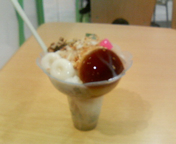 カキ氷っぽいのにプリンやら白玉やらが乗ってて、ココナッツミルクがかけてあるのです